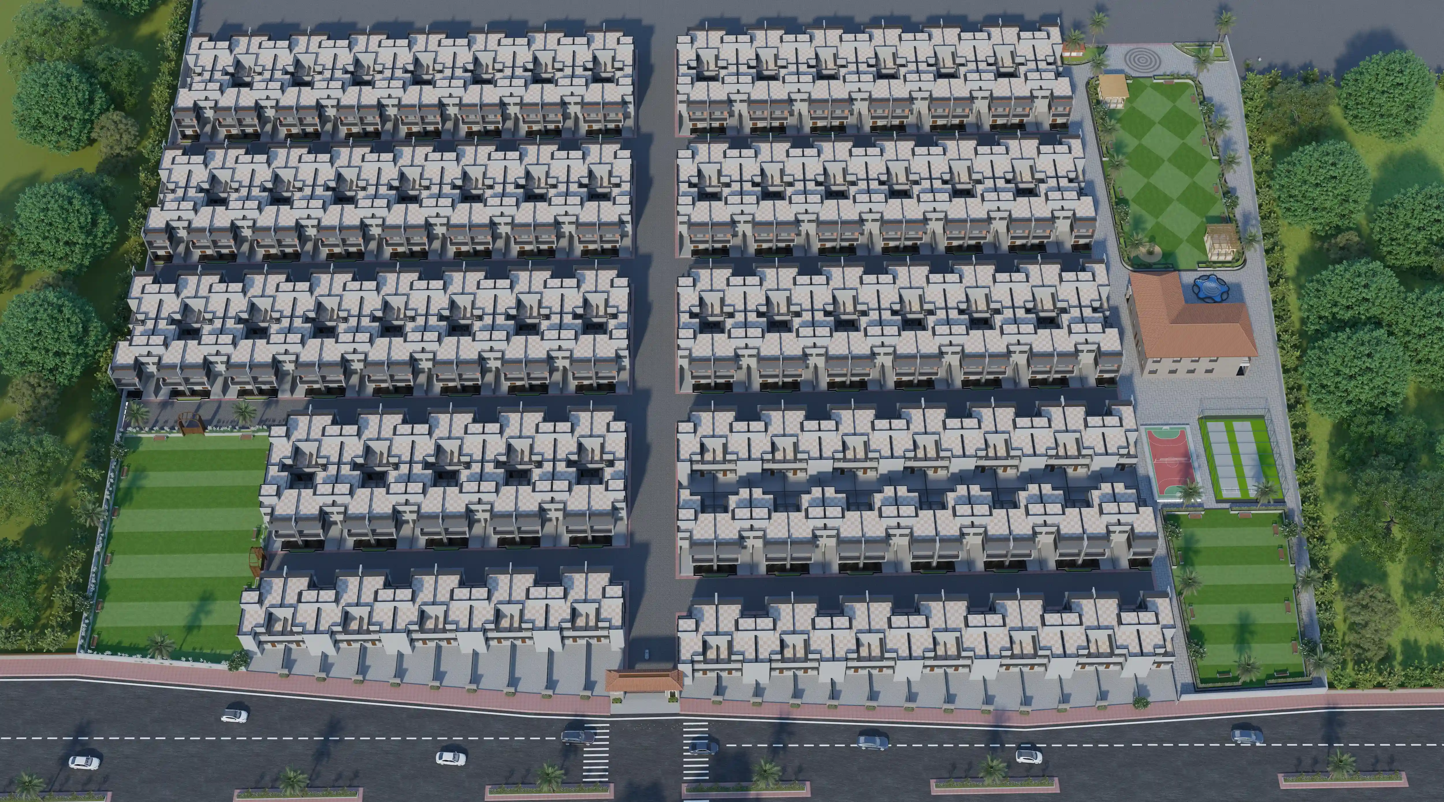 This project offers a mix of 2 BHK and 3 BHK row houses with modern layouts and private spaces. Every unit is vastu-compliant and designed for optimal sunlight and ventilation. Being part of a gated community, you’ll enjoy the perfect blend of privacy, safety, and neighborly comfort. These residential row houses in Surat are suitable for families, working professionals, and retirees alike. The community ensures 24/7 security and planned walkways so that children and elders alike can enjoy peaceful and safe living.